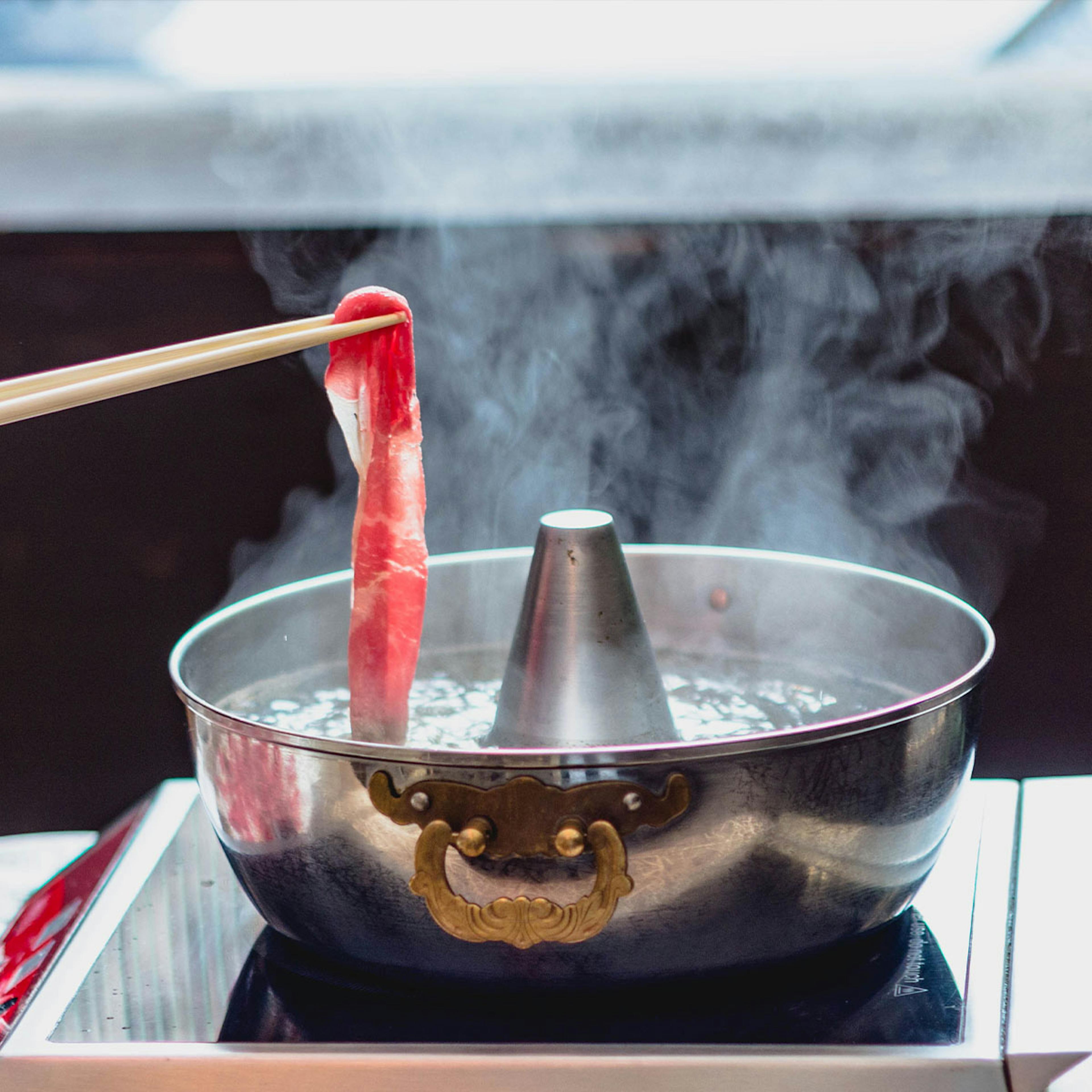 - Take one meat slice and without letting go, swish the meat in the bubbling water for about 5-10 seconds until cooked. Overcooking leads to tough meat, not melt-in-your-mouth meat.